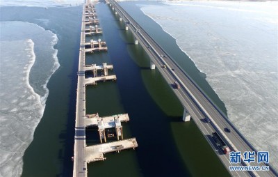 这是2月14日航拍的横跨官厅水库的京张高铁特大桥(左)与京张高速公路特大桥。
