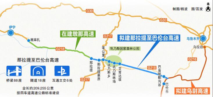 招标公告显示,该项目位于伊犁哈萨克自治州和巴音郭楞蒙古自治州境内,起点位于那拉提镇东侧阿拉山口,与在建的墩那高速顺接;终点布设于巴伦台镇北侧下新光火车站附近,接乌尉高速。