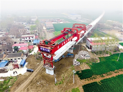 图为4月6日,工程人员在郑万铁路河南段3标段进行架梁作业。
