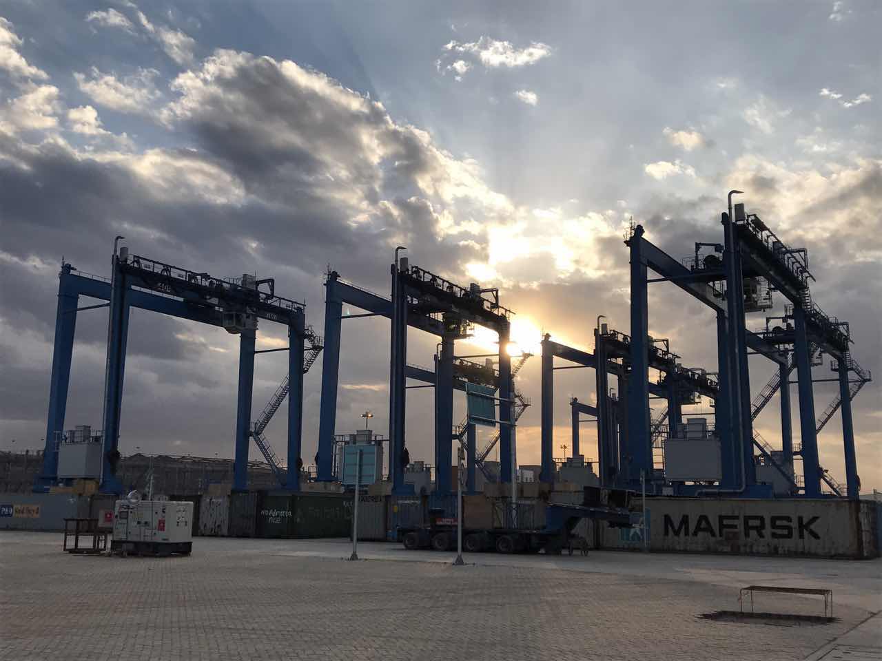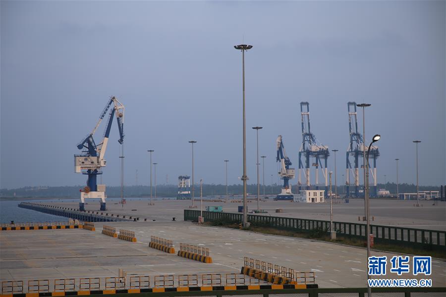 已经基本竣工的汉班托塔港二期,一台台门机、暗桥等大型设备仰望天空般矗立在码头上。(图片来源:新华社 朱瑞卿摄)