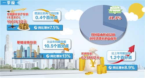 国家统计局近日公布的数据显示,今年一季度,全国固定资产投资(不含农户)100763亿元,同比增长7.5%,增速比前两个月回落0.4个百分点,比去年同期回落1.7个百分点。