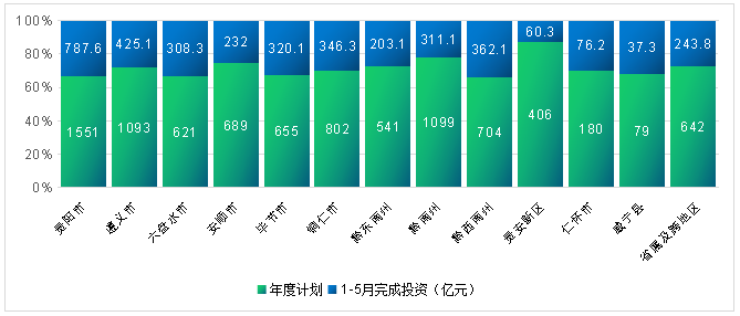 分地区看,黔西南州、贵阳市和六盘水市分完成投资占年度投资目标的比重达到51.4%、50.8%和49.6%。