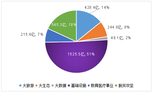 分重点领域看,“三长三短”项目完成投资3008.8亿元、占年度投资目标的41%,占全省重大工程项目完成投资的比重达到81%。其中,大数据、大生态、大旅游“三块长板”项目完成投资722.3亿元,脱贫攻坚、基础设施、教育医疗“三块短板”项目完成投资2286.5亿元,脱贫攻坚和大数据领域项目完成投资分别占年度投资目标的比重达到50.2%和?41.8%,大旅游、大生态、基础设施、教育医疗等项目完成投资占年度投资目标的比重均达到39%以上。此外,重大工业项目完成投资408.2亿元。