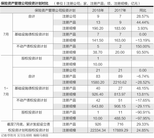 经21世纪经济报道记者计算,2018年7月,9家保险资产管理公司共注册各类资产管理产品13项,合计注册规模190.20亿元。与之对比,2017年7月,7家保险资产管理公司注册债权投资计划共9项,合计注册规模183.00亿元。这意味着,注册公司数量同比提高28.57%,注册项目数量、规模同比提高44.44%、3.93%。