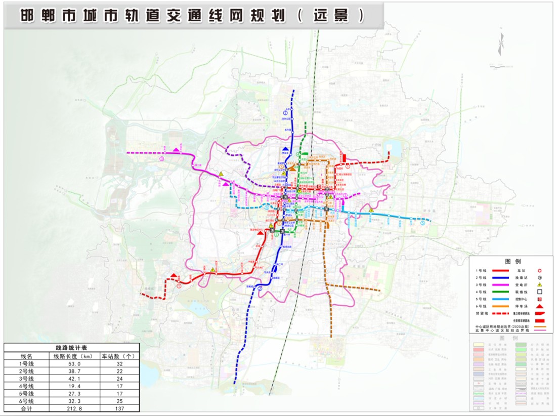 线网规划概况:邯郸市轨道交通线网由6条线组成,全长212.8km,共设车站137座,车辆基地6处,停车场6处。控制中心1处,主变电所8座。