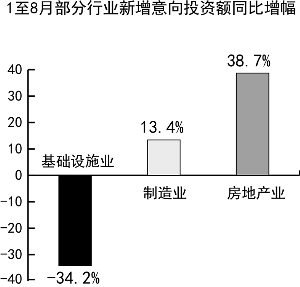 从各领域行业投资发展趋势来看,差别明显。数据显示,1至8月份,基础设施业、制造业、房地产业新增意向投资额分别同比增长-34.2%、13.4%、38.7%。
