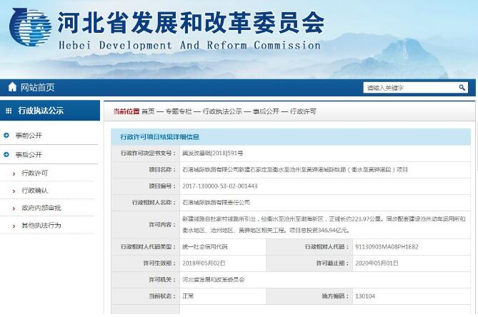 河北省发改委近日公布石港城际铁路有限公司新建石家庄至衡水至沧州至黄骅港城际铁路(衡水至黄骅港段)项目的行政许可决定书。