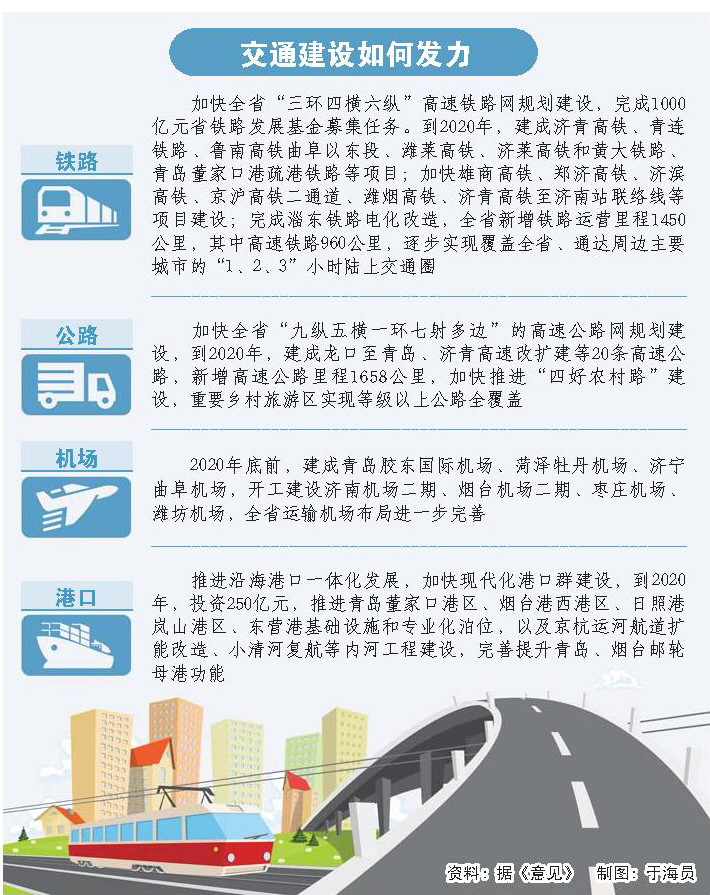 高速公路曾是山东的名片,但近年来发展却相对落后。紧随铁路之后,《意见》对公路建设提出具体要求,加快全省“九纵五横一环七射多边”的高速公路网规划建设,到2020年,建成龙口至青岛、济青高速改扩建等20条高速公路,新增高速公路里程1658公里。