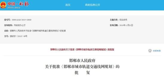 你委《关于提请批准〈邯郸市城市轨道交通线网规划〉的请示》(邯发改呈〔2018〕150号)收悉。经研究,现批复如下:
