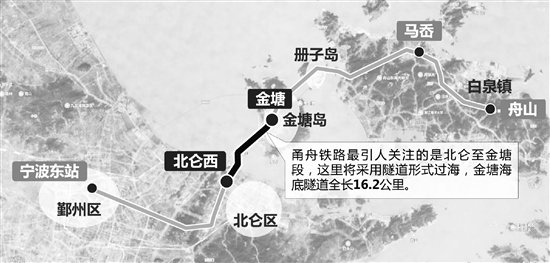 甬舟铁路最引人关注的应该是北仑至金塘段,这里将采用隧道形式过海。金塘海底隧道全长16.2公里,其中海底盾构段长10.87公里,该隧道将是国内设计最长、承受水压最高的水下高铁盾构隧道。这也将是国内首条跨海高铁隧道。甬舟铁路一旦建成,不但将结束舟山不通火车的历史,而且从宁波市区出发坐火车到舟山,也只要30分钟左右时间!