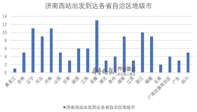根据统计,从济南西站出发,可以到达的地级市中以安徽省最多。