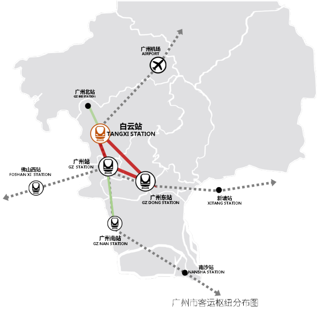 白云站位于广州中心城区西北部,根据《广州铁路枢纽总图规划》,广州将形成以广州、广州东、广州南、佛山西、白云站为主客站,以广州北、南沙、新塘站为辅助站的“五主三辅”客站布局。