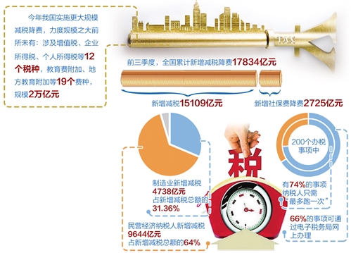 今年我国实施更大规模减税降费,最新统计显示,前三季度,全国累计新增减税降费17834亿元,其中新增减税15109亿元,新增社保费降费2725亿元。