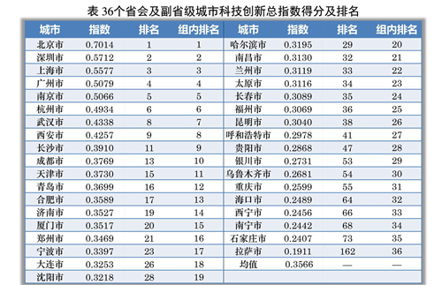 从省会省市来看,仅北京、深圳、上海、广州、南京、杭州、武汉、西安、长沙、成都、天津、青岛和和合肥13个城市的科技创新发展指数高于均值。