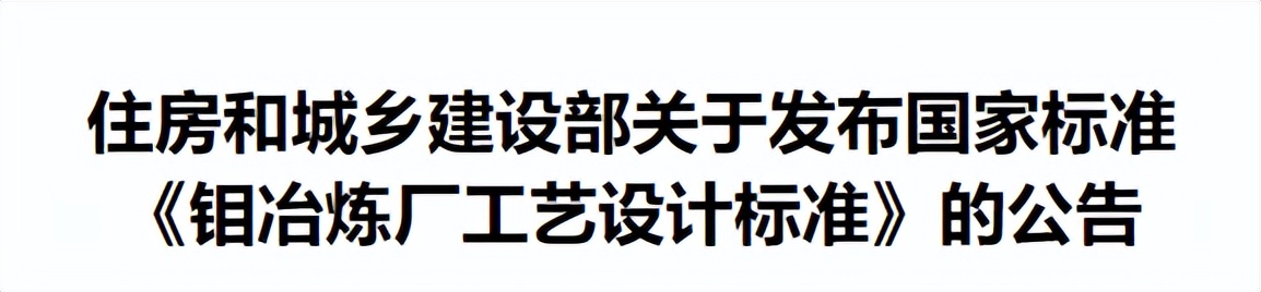 现批准《钼冶炼厂工艺设计标准》为国家标准,编号为GB51442-2022,自2022年5月1日起实施。其中,第3.2.7条为强制性条文,必须严格执行。