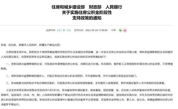 通知还指出,上述支持政策实施时限暂定至2022年12月31日。各地要按照本通知要求,高度重视,周密部署,省、自治区人民政府要做好政策实施的指导监督,直辖市、设区城市(含地、州、盟)人民政府和新疆生产建设兵团可结合本地企业受疫情影响的实际,提出具体实施办法,并在支持政策到期后做好向住房公积金常规性政策的衔接过渡。各地住房公积金管理中心要通过综合服务平台等渠道,实现更多业务网上办、掌上办、指尖办,保障疫情期间住房公积金服务平稳运行。