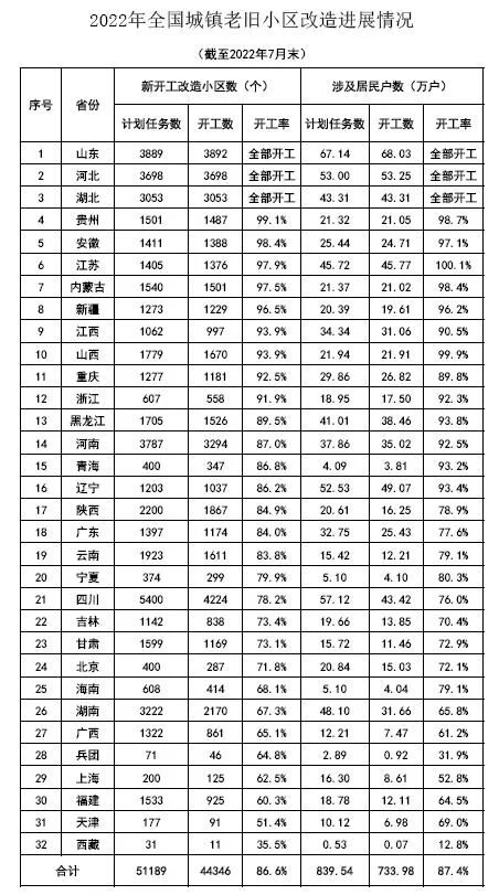 住房和城乡建设部近日公布信息显示,2022年1—7月份,全国新开工改造城镇老旧小区4.43万个、近734万户,按小区数计占年度目标任务的86.6%。其中,开工进展排名靠前的地区为山东、河北、湖北、贵州、安徽、江苏、内蒙古、新疆。