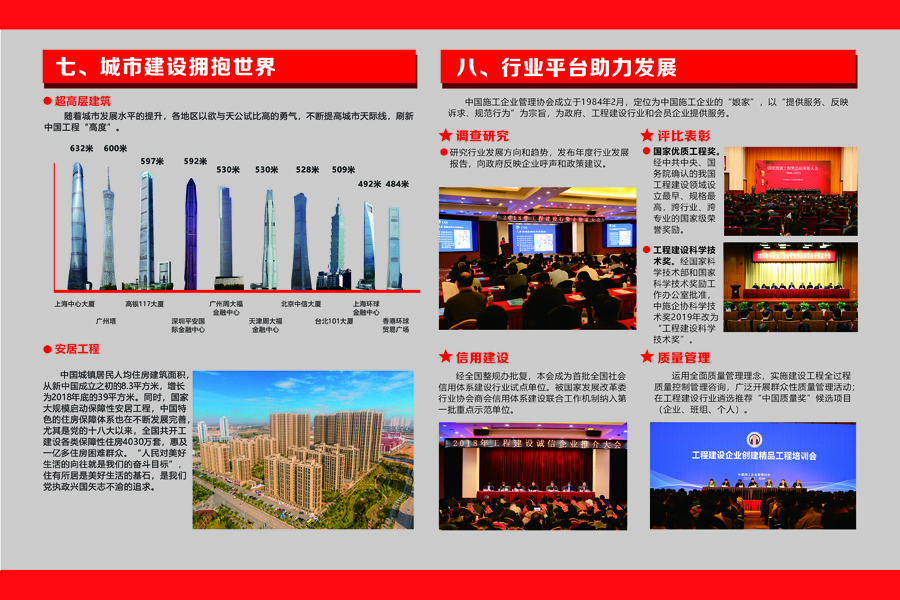 | 因为你的装点,让大地变得美好;因为你的存在,让人民安居乐业;道路、桥梁,横跨了几多天堑;大坝、电站,带给我们无限的光明;高楼、大厦,给予我们幸福的梦想;地铁、高铁,更是拉近了我们追梦的征程。您犹如钢铁脊梁,撑起了经济发展的四梁八柱,您就是坚守的地标,树起了工程建设史上的座座丰碑。本次宣传展示活动,共推选出100项经典工程。 |